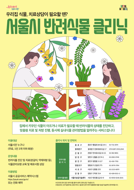 플랜테리어, 반려식물이라는 말은 요즘 흔히 듣지만 막상 실내에서 식물을 기르기란 쉽지 않습니다. 집에서 기르는 식물이 병들거나 잘 자라지 않을 때 서울 시에서 운영하는 반려식물 클리닉을 찾아 상태에 따른 맞춤 처방을 받고 관리 방법을 배울 수 있습니다. <서울시 반려식물 병원 & 클리닉> ㅇ 운영장소 : 종로·동대문·은평·양천, 광진, 영등포, 관악, 서초, 강동 ※ 반려식물병원: 서울시농업기술센터 ㅇ 운영시간: 평일 10:00 ~ 17:00 ※자치구별로 세부 일정 확인 필요 ㅇ 이용대상 및 이용료: 서울시민 누구나 무료