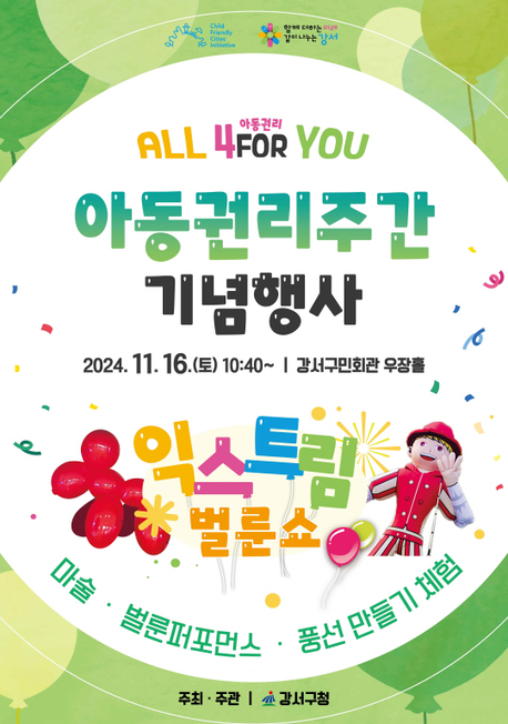 11월 19일은 아동의 권리를 지키고 아동 학대 문제에 대한 관심을 제고하기 위해 지정한 '아동 학대 예방의 날'입니다. 강서구에서는 16일부터 22일을 '아동권리주간'으로 지정하고, 다양한 행사는 진행한다고 합니다. 올해 행사는 '아동권리 ALL 4(FOR) YOU'라는 슬로건 아래, 아이들의 생존권, 발달권, 보호권, 참여권을 알리는 데 초점을 맞췄다고 해요. 16일 강서구민회관에서는 아동 학대 예방 캠페인, 아동 권리 교육 영상 시청, 기념 공연 등이 열리고, 특히 아이들에게 즐거운 추억을 선사할 풍선 쇼가 마련되어 있