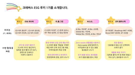 크레버스 ESG 루키는 환경을 사랑하는 직원들이 자발적으로 모여 유닛별 활동을 하는 모임입니다. ESG 루키 1기로는 4개 유닛 16명의 직원이 활약했습니다. 여기 소개된 활동은 24년 8월 기준의 활동이며, 최신 소식과 신규 모집 소식은 다시 전해드리겠습니다.