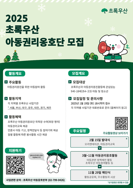아동 복지 전문 기관 '초록우산'은 아동을 위한 어른들의 관심을 촉구할 뿐 아니라 아동을 위해 아동이 직접 참여하는 활동도 운영합니다. 내년 한 해 아동 권리 증진 활동에 참여할 아동/청소년을 지금 모집하고 있어요. '아동권리옹호단'에 선발되면 아동이 안전한 온라인 환경 만들기, 아동 관련 정책과 지역별 아동 문제 해결 등의 활동에 참여하게 됩니다. 열심히 참여하면 봉사 시간 인증, 언론 기고 참여 등이 혜택으로 주어진대요. 사회 문제에 관심 있는 자녀, 조카가 있다면 아동권리옹호단 모집 소식을 전해주세요. 내용 및